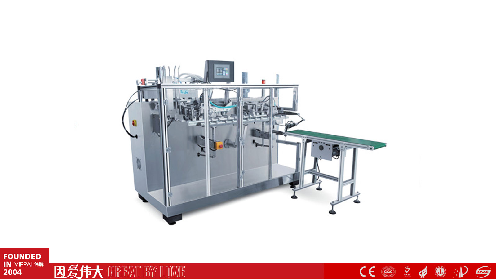 VPD200半自动水平给袋灌装机 适用于液体、酱料、面膜精华等的定量添加,自动完成开袋、添加液体、封口、打印日期、成品出库。高精度、高产量,封口牢固、平整、美观。适用于四边封袋、异形袋、自立袋等各种规格的预制袋